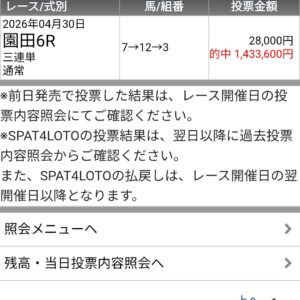 直近でもその精度を裏付ける驚きの結果が出た。4月30日の園田6Rにて、1,433,600円の的中を記録。この配当は、単なる運や統計データだけでは到底辿り着けない数字だ。